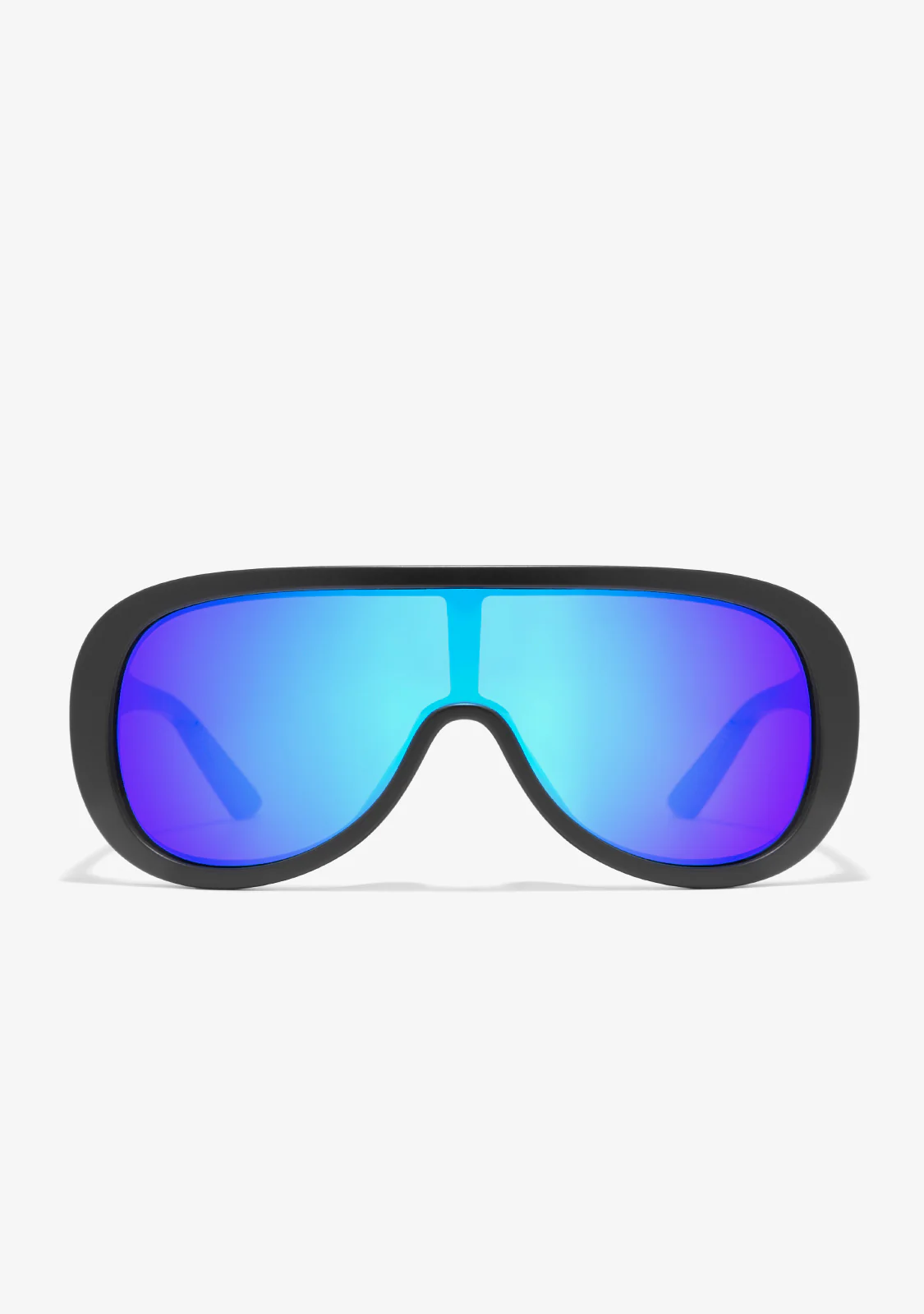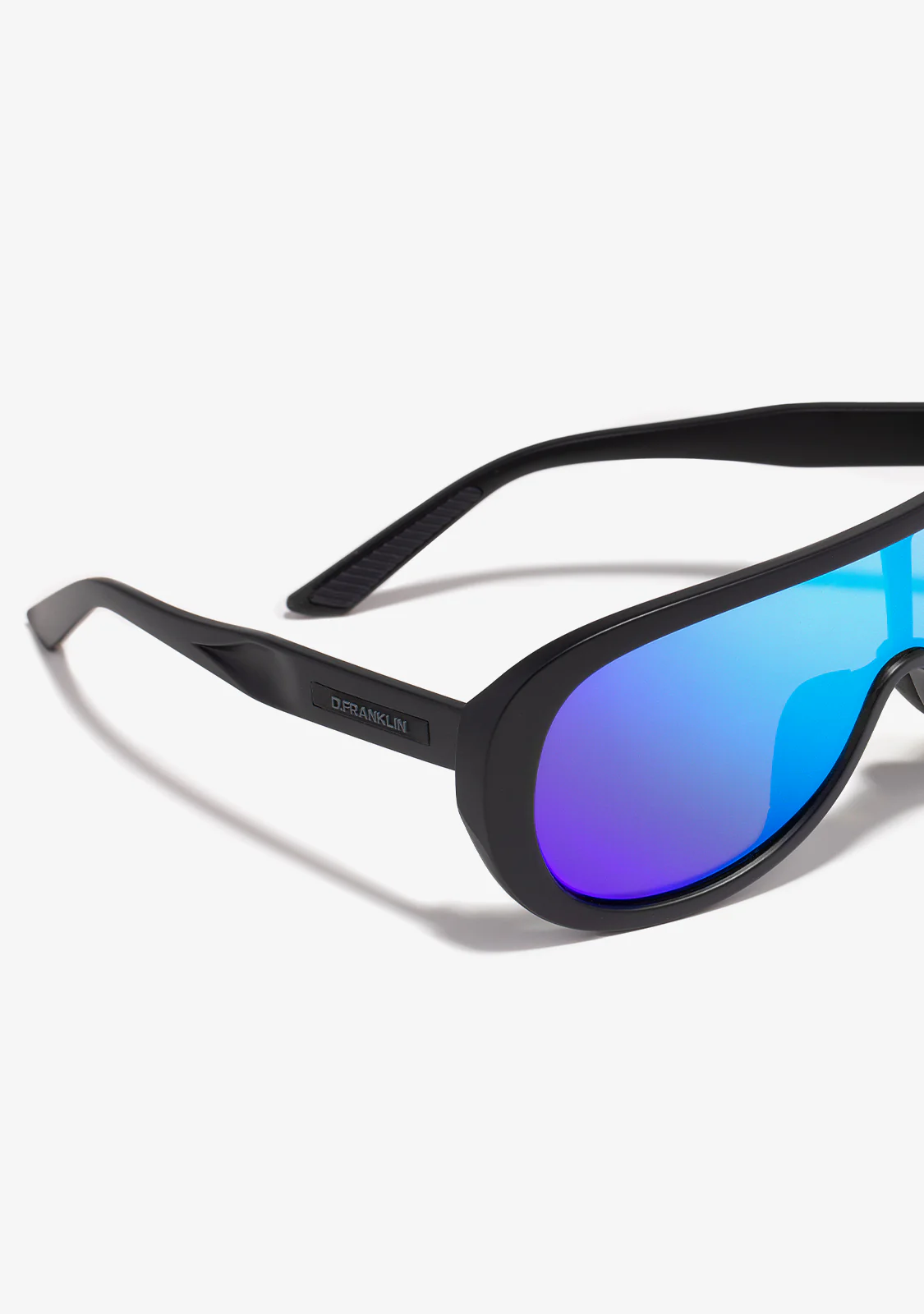 Este modelo presenta una montura con acabado mate negro y una estética ligeramente curvada. Cuenta con lentes en tono azul psicodélico y nuestro distintivo emblema en el lateral de las patillas. El ancho uniforme de lente de 131mm y el marco frontal de 147mm quedan unidos mediante una varilla de 135mm.