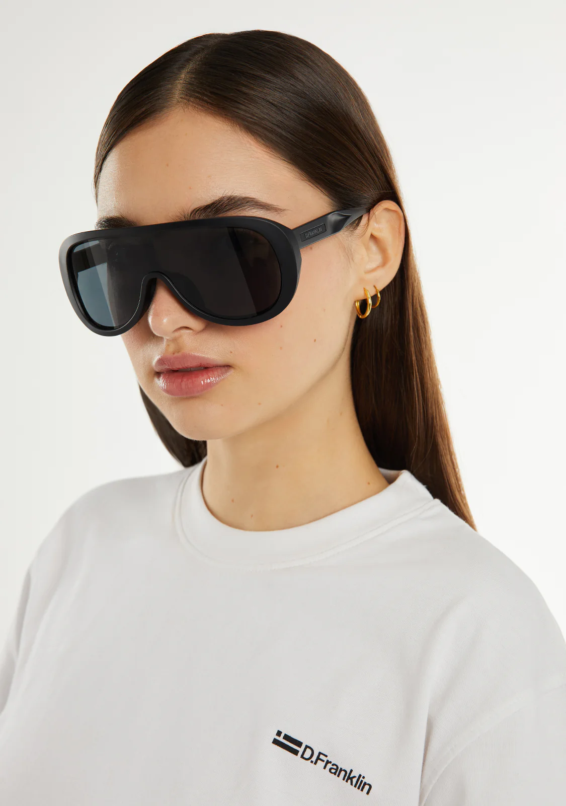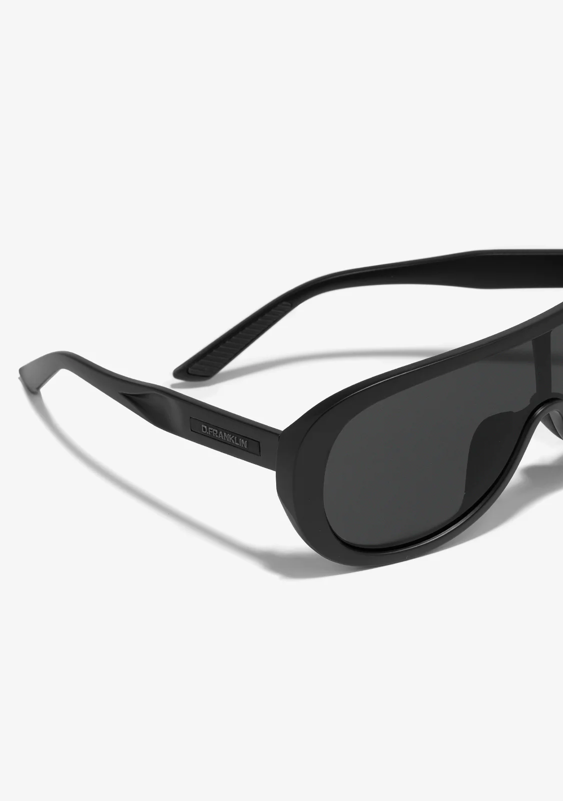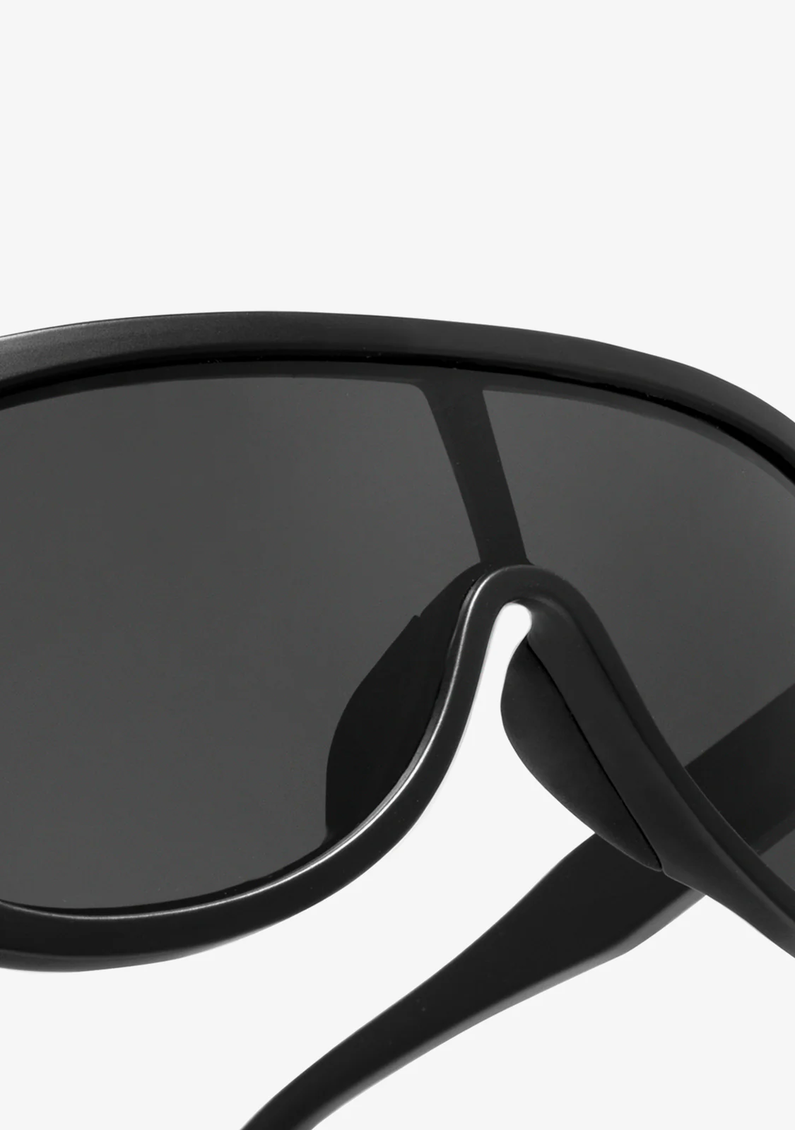 Este modelo presenta una montura con acabado mate negro y una estética ligeramente curvada. Cuenta con lentes ahumadas y nuestro distintivo emblema en el lateral de las patillas. El ancho uniforme de lente de 131mm y el marco frontal de 147mm quedan unidos mediante una varilla de 135mm.