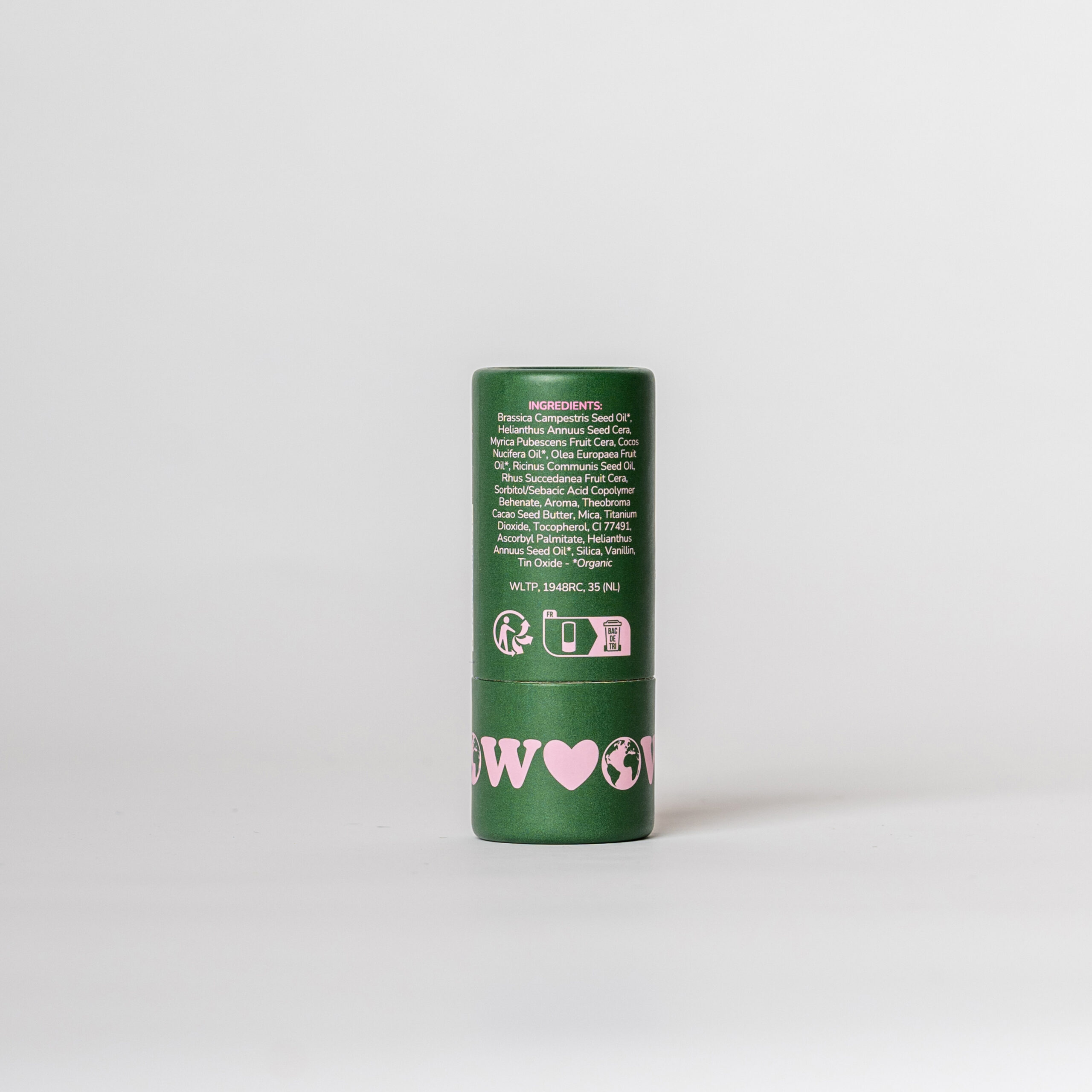 INCI: Brassica Campestris Seed Oil*, Helianthus Annuus Seed Cera, Myrica Pubescens Fruit Cera, Cocos Nucifera Oil*, Olea Europaea Fruit Oil*, Ricinus Communis Seed Oil, RhusSuccedanea Fruit Cera, Sorbitol/Sebacic Acid Copolymer Behenate, Aroma, Theobroma Cacao Seed Butter, Mica, Titanium Dioxide, Tocopherol, CI 77491, Ascorbyl Palmitate, Helianthus Annuus Seed Oil*, Silica, Vanillin, Tin Oxide – *Organic