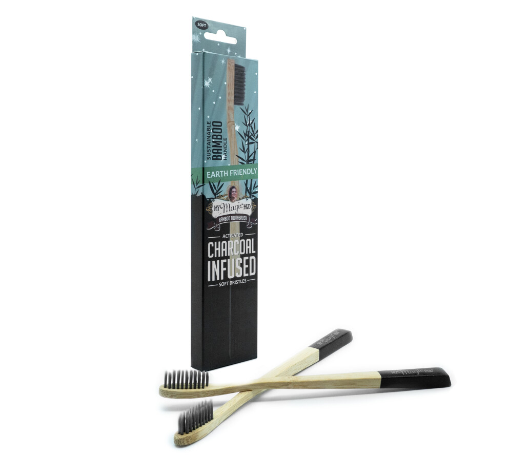 Cepillo de bambú con carbón activo de My Magic Mud. Cuida tus dientes de la forma más natural y sostenible. Producto totalmente biodegradable.