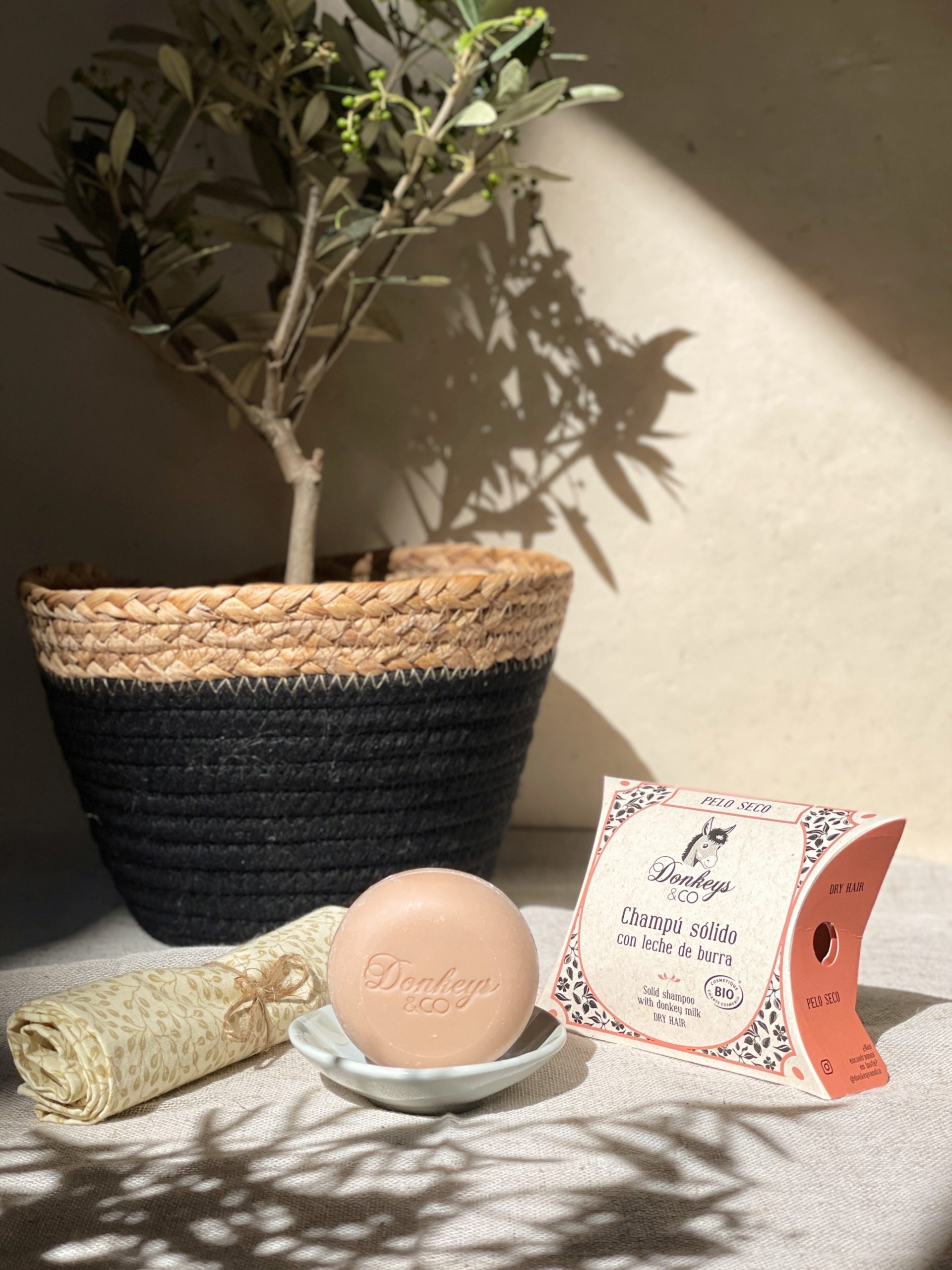 El champú sólido con leche de burra para cabello seco de la casa Donkeys & Co respeta el cuero cabelludo y el cabello . Como buen producto Zero Waste, su envase es reciclable.