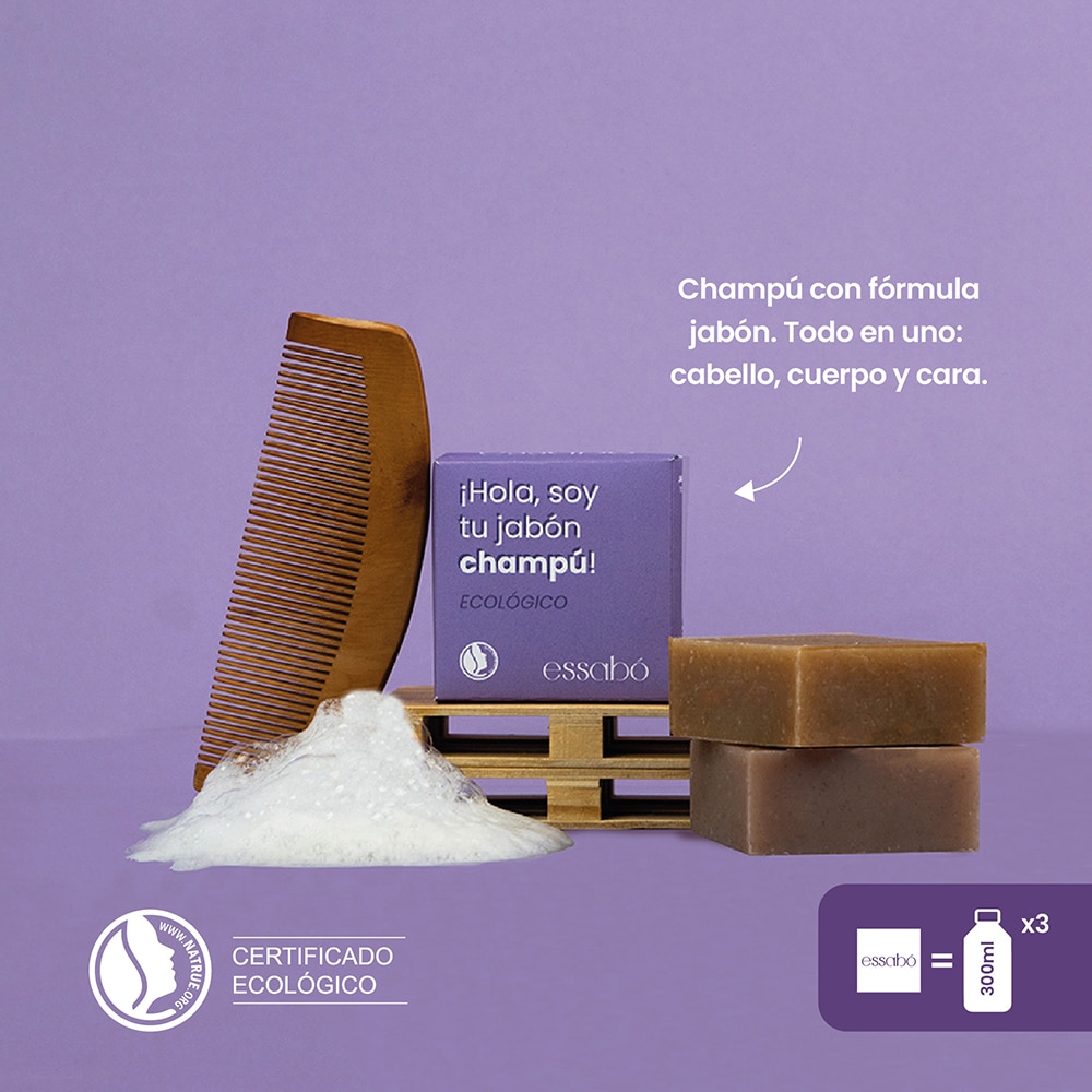 Champú sólido Essabó, está formulado únicamente a base de jabón, sin tensioactivos, y por ello es la manera más natural y efectiva de limpiar el cabello.