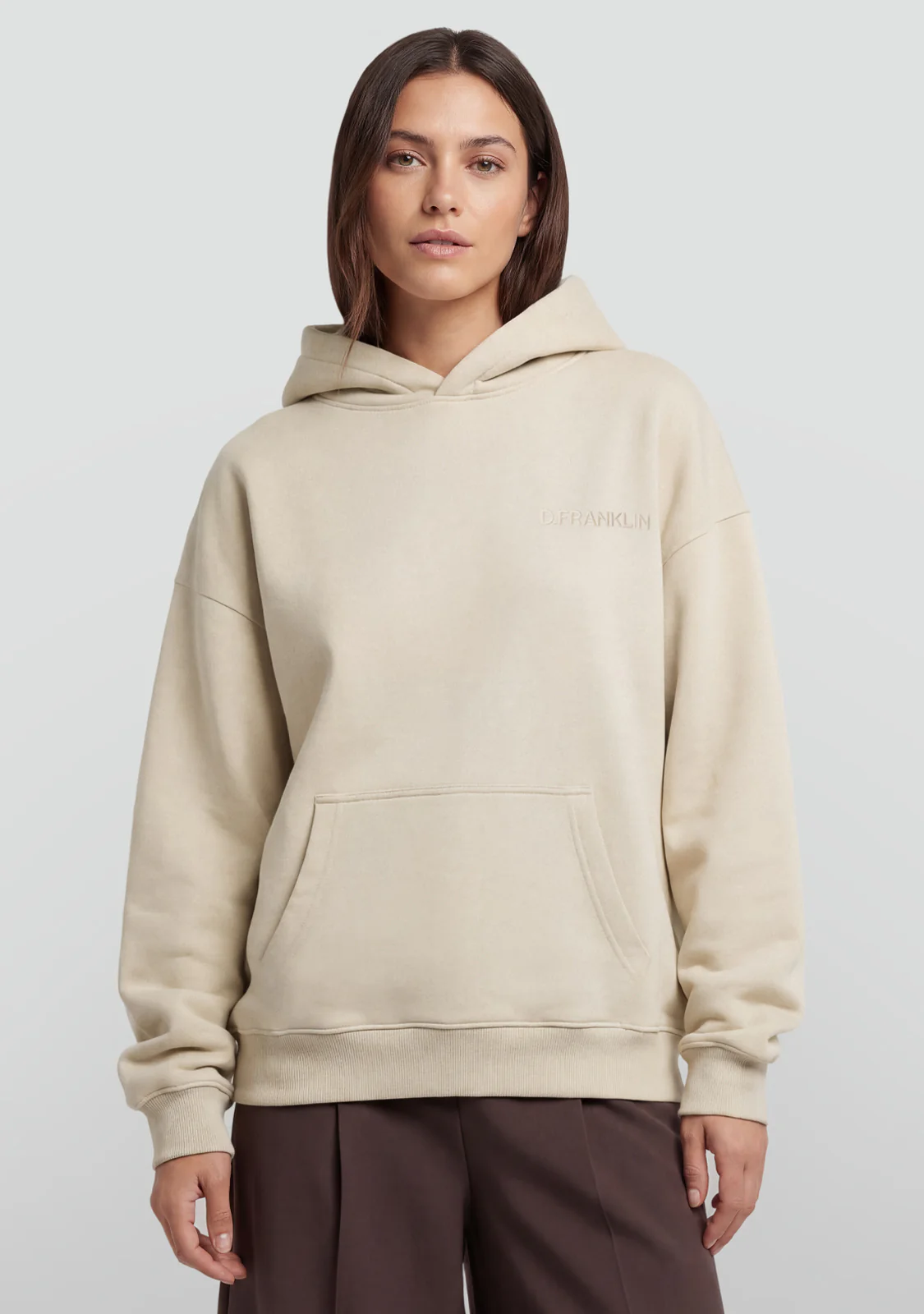 Los detalles de logo en el pecho y la manga le dan un toque especial, mientras que el bolsillo frontal clásico y los acabados de canalé mantienen la esencia de una hoodie atemporal.