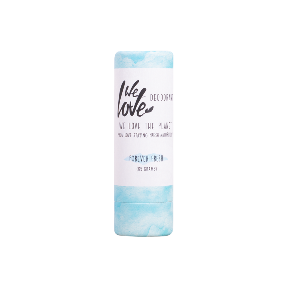 Desodorante en Stick Forever Fresh de We Love The Planet se presenta en un práctico formato stick elaborado con cartón 100% reciclable.