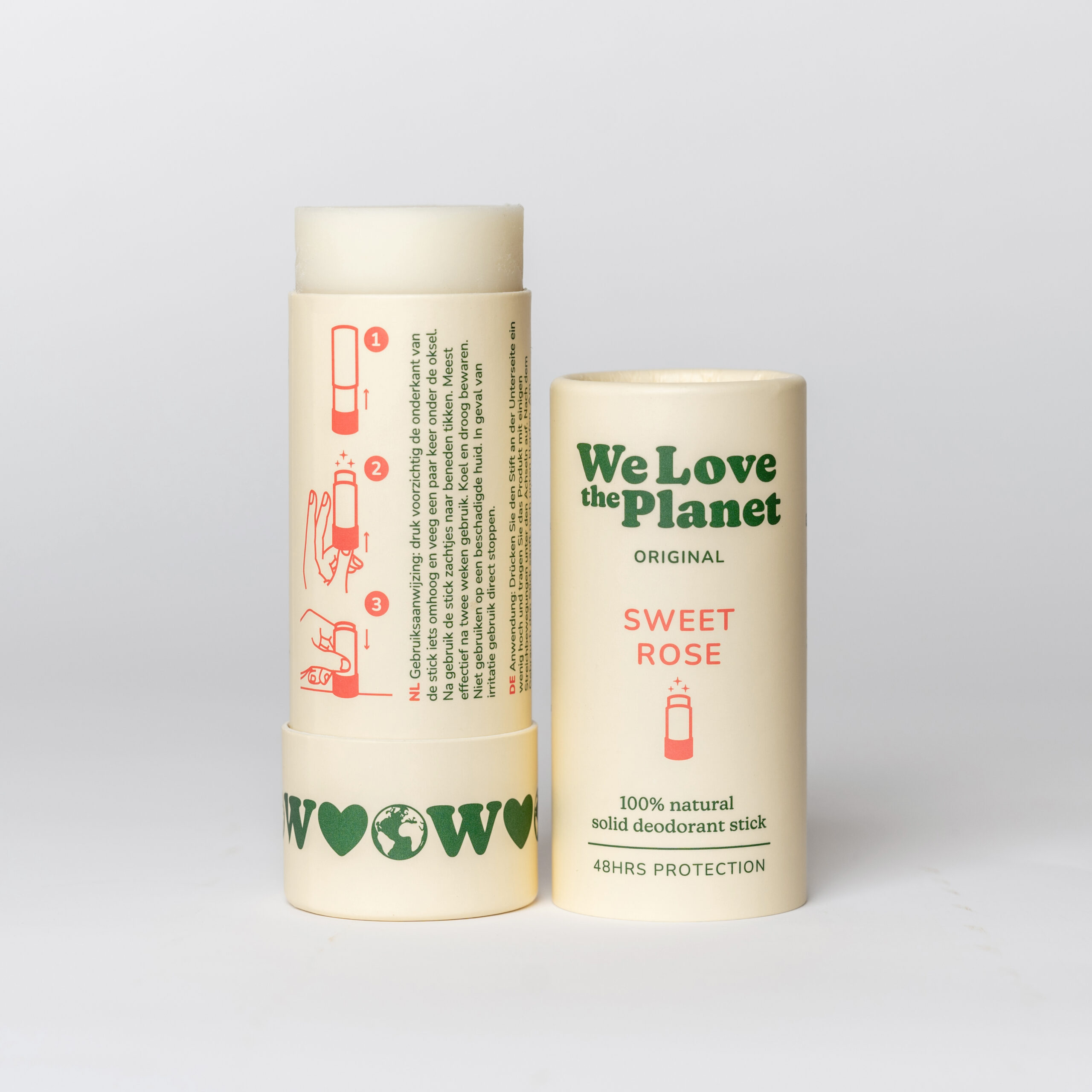 El desodorante natural en stick Sweet Rose de We Love The Planet se presenta en un práctico formato elaborado con cartón 100% reciclable.