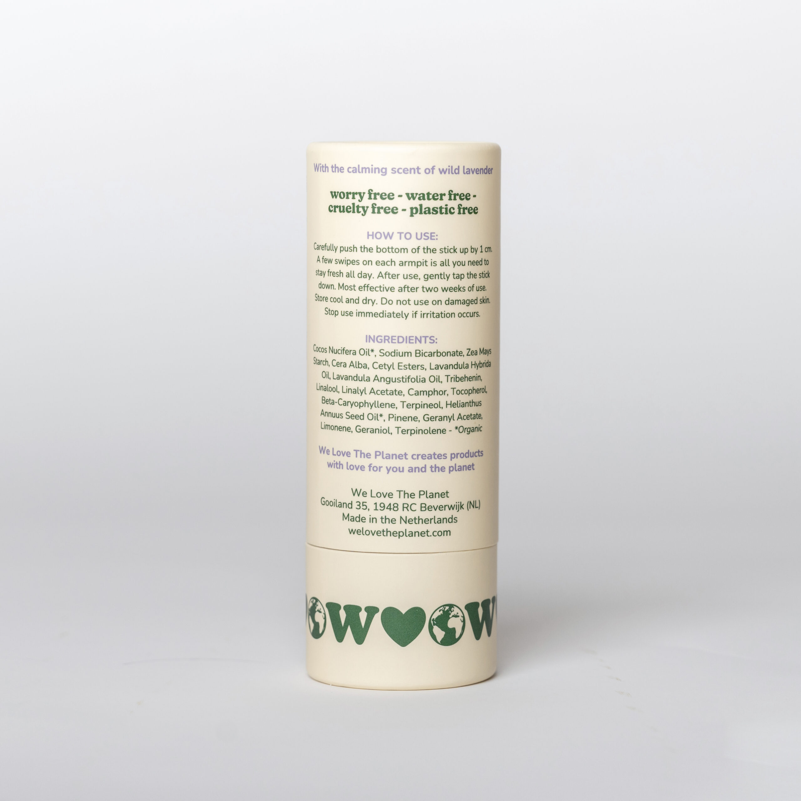 El desodorante en stick ecológico de We Love The Planet se presenta en un práctico formato stick elaborado con cartón 100% reciclable.