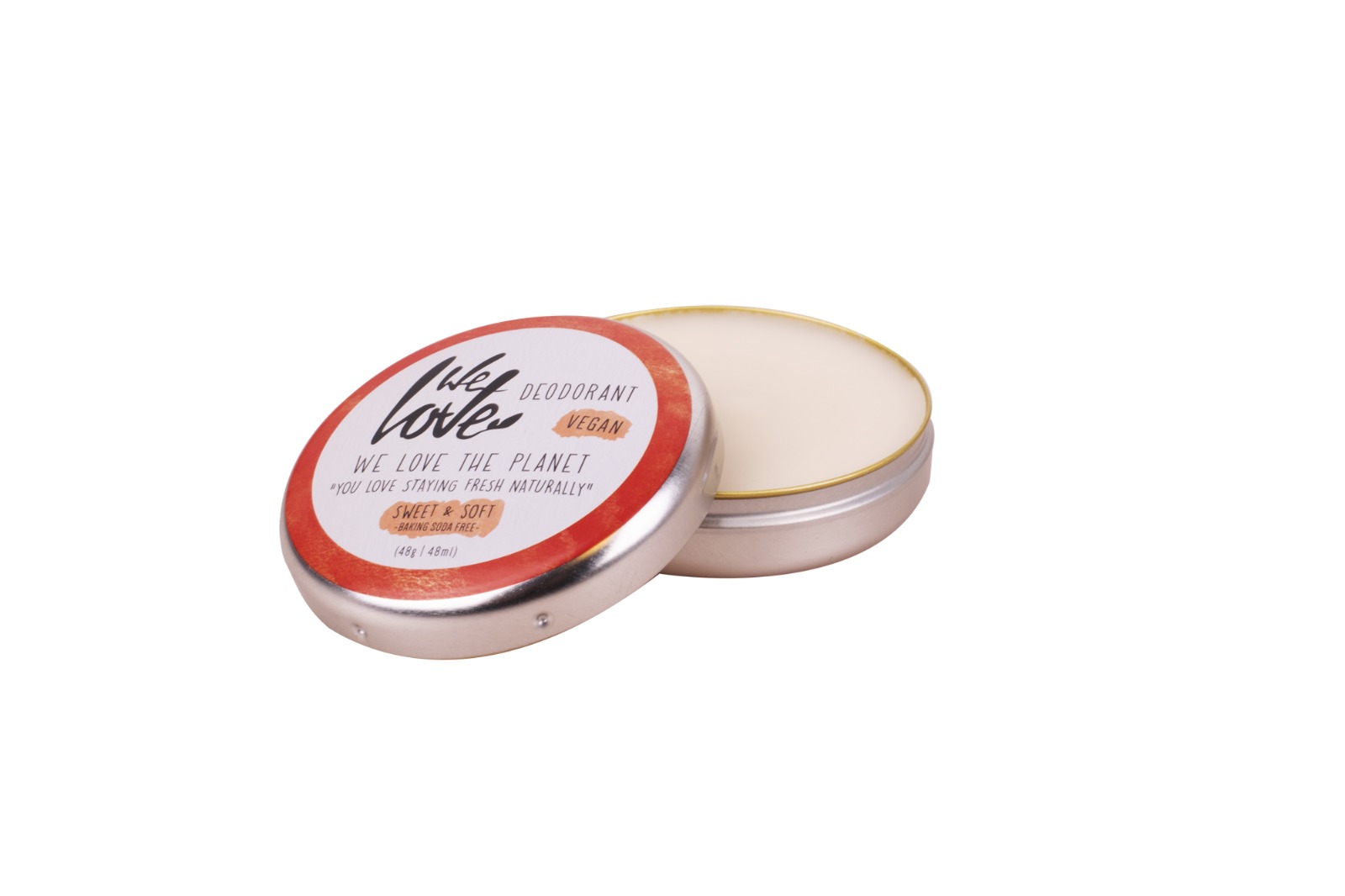 El desodorante natural vegano en crema Sweet and Soft de We Love The Planet se presenta en una elegante y práctica lata metálica.