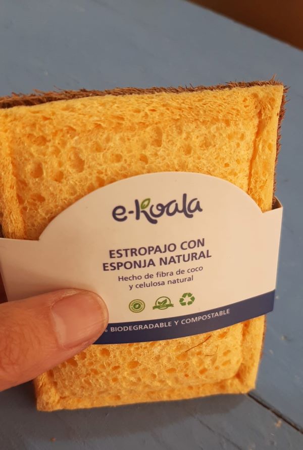 El estropajo de esponja natural y fibra de coco, está hechos con celulosa natural fabricada a partir de la pulpa de la madera y de fibra de coco prensado con caucho derivado del látex natural.