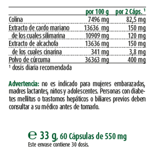 INGREDIENTES: Cúrcuma en polvo: 18 % de L-bitartrato de colina. Agente de recubrimiento: hidroxipropilmetilcelulosa. 14 % de extracto de frutos de cardo mariano. 14 % de extracto de alcachofa (maltodextrina, extracto de alcachofa).