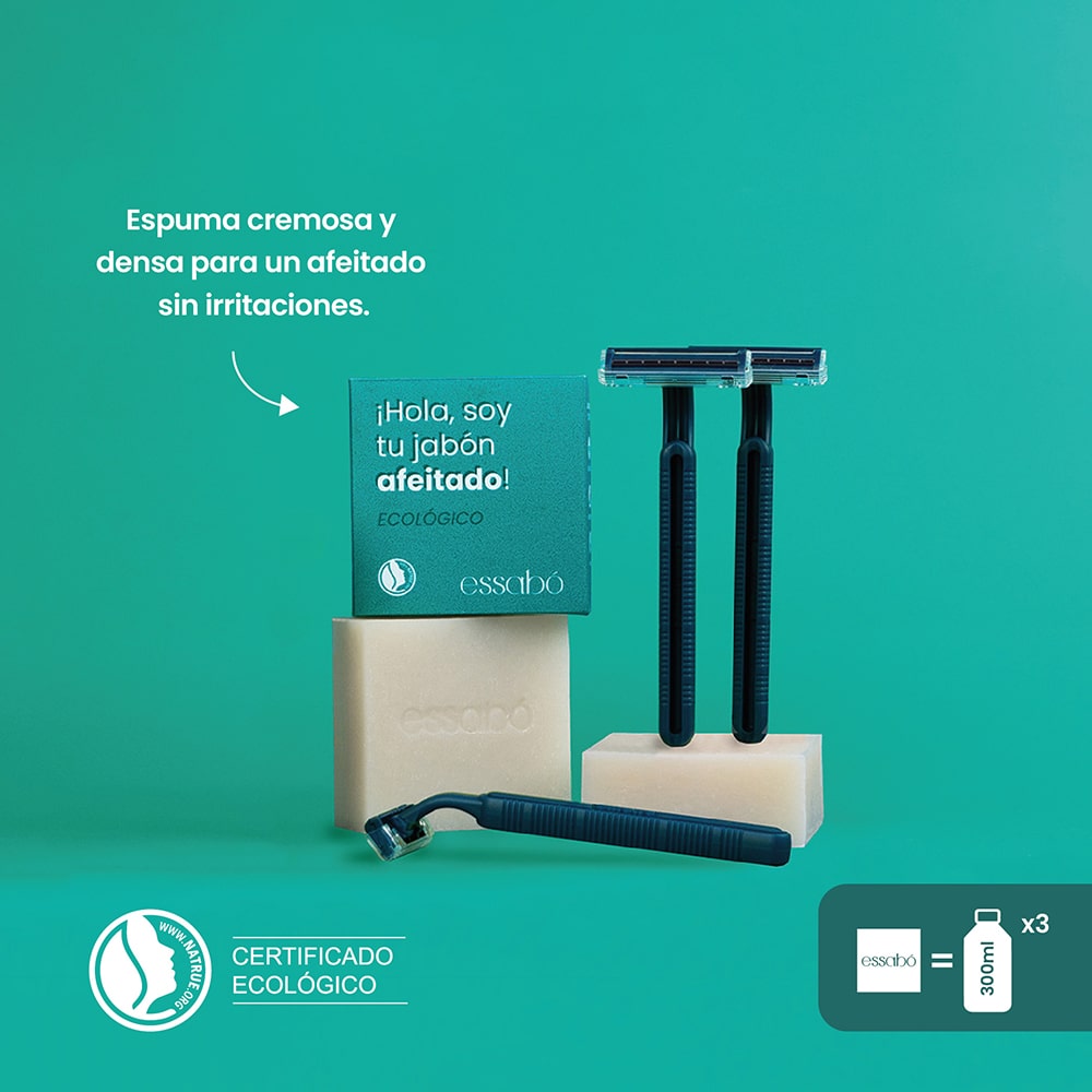 Con Essabó Afeitado puedes depilar tu cuerpo con cuchilla de manera fácil, rápida y natural, evitando productos sintéticos de depilado corporal. Humedece la pastilla con las manos y, con la piel mojada, enjabona la parte del cuerpo a depilar, cubriéndola todo lo posible con espuma. Pasa la cuchilla suavemente y al finalizar enjuaga bien la zona.