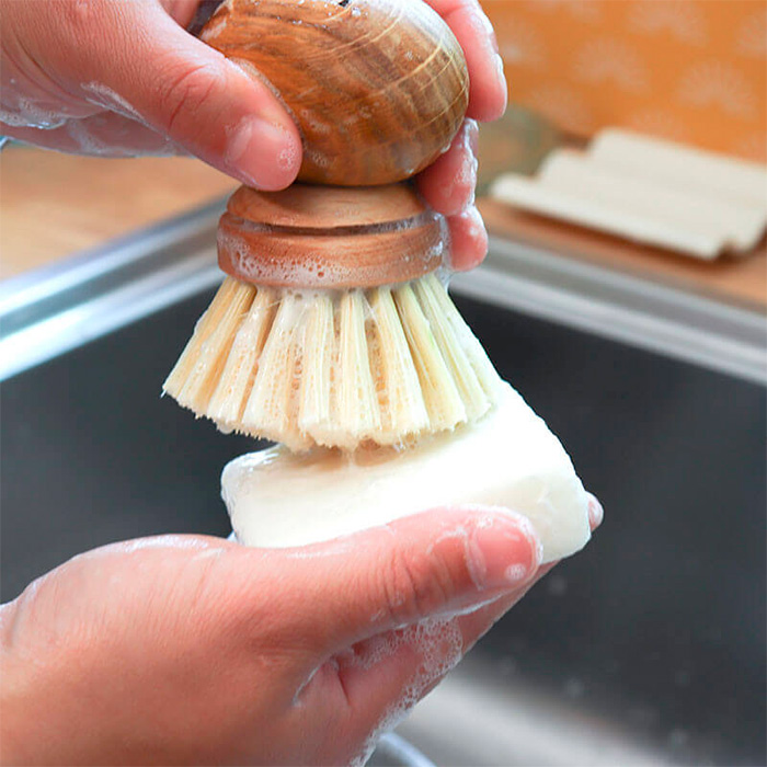 Frota la pastilla con la esponja o cepillo y… ¡Limpia tus platos y luego enjuágalos, como lo harías habitualmente! Te recomendamos el cepillo de madera de Lamazuna para una aplicación perfecta del jabón.