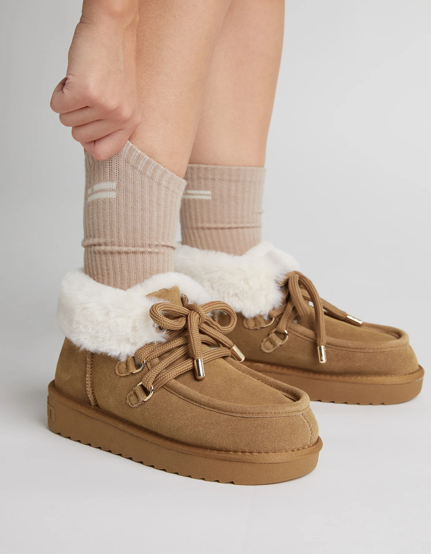 Las Nordic Mid Fur Tan están fabricadas con un 80% de piel de serraje y un 20% de poliéster en el exterior, haciendo que estas botas de invierno sean más resistentes y duraderas.